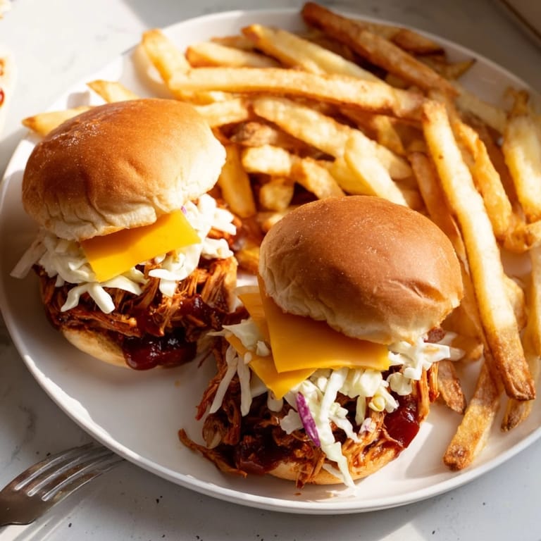 Save There’s something wonderfully comforting about juicy shredded BBQ chicken nestled inside soft slider buns, paired with crispy golden fries. This BBQ Chicken Sliders & Fries recipe is the ultimate crowd-pleaser—perfect for casual get-togethers or a family dinner when you want something flavorful yet easy to prepare. Each bite combines smoky, tender chicken with melty cheddar and fresh coleslaw, creating a delicious balance of textures and tastes.