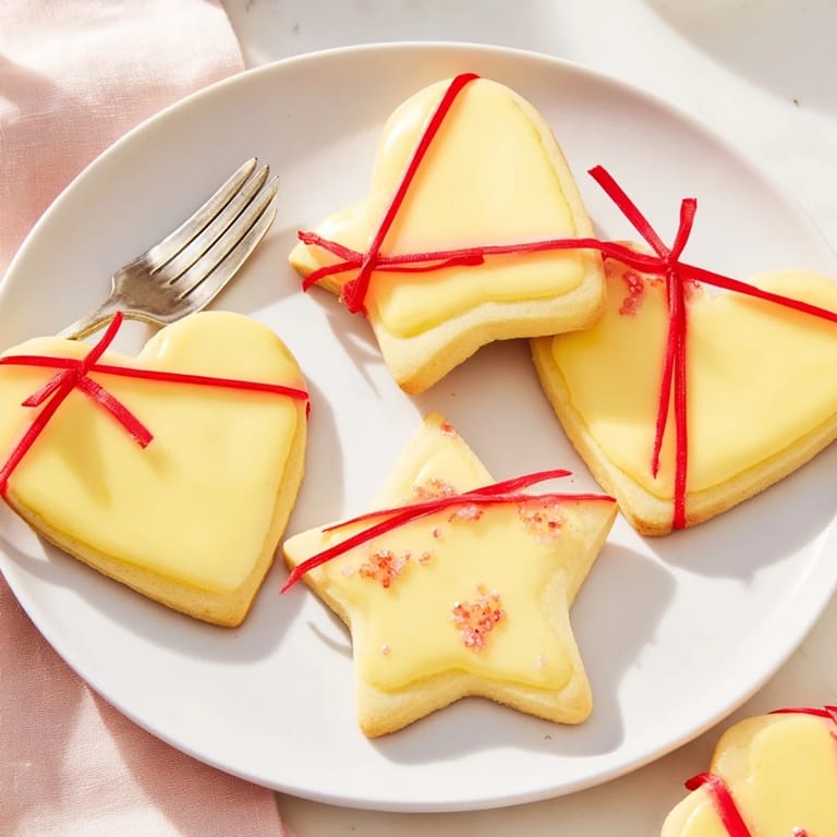 Save Adorable heart and star-shaped cookies tied with ribbons, perfect for gifting or festive occasions. These buttery treats are delicately flavored with vanilla and can be decorated as you wish.