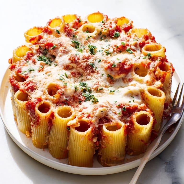 Save A stunning baked rigatoni dish where pasta stands upright, filled with rich tomato sauce, creamy ricotta, and gooey melted cheese, perfect for impressing guests and feeding a crowd.