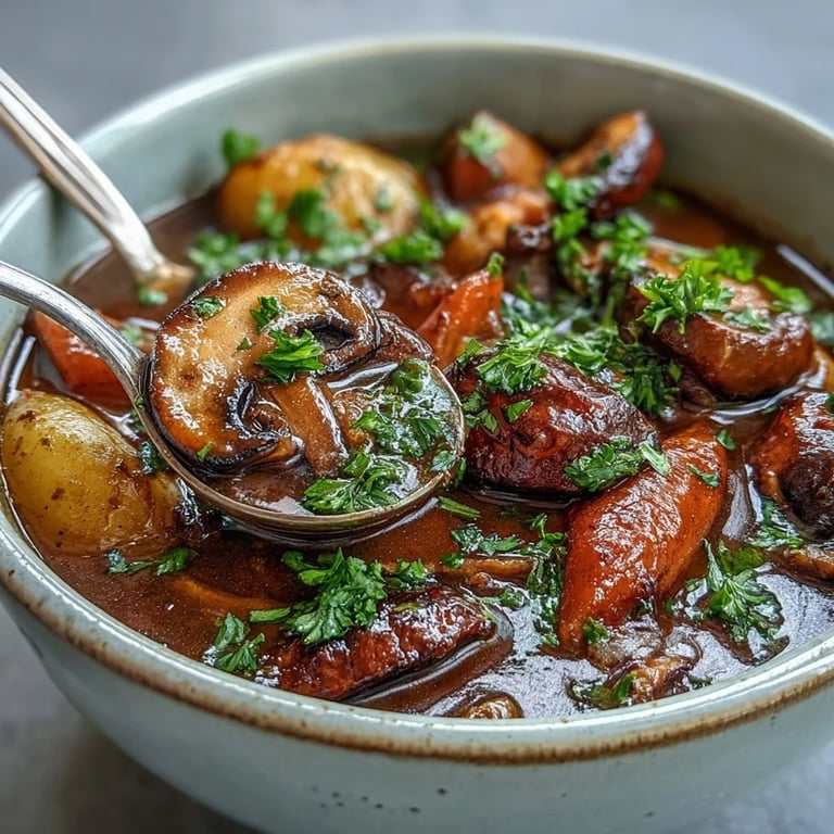 Crusty bread is absolutely essential—not optional, but truly necessary. You need something to soak up every drop of that incredible broth, and good bread does exactly that. Pour your stew into a wide bowl, tear chunks of bread, and use each piece to catch vegetables and broth together. If you're thinking about wine, a robust red like a vegan Merlot brings out the earthiness of the mushrooms and herbs without competing for attention. This is also the kind of stew that's even better the next day, once all the flavors have had time to really know each other.