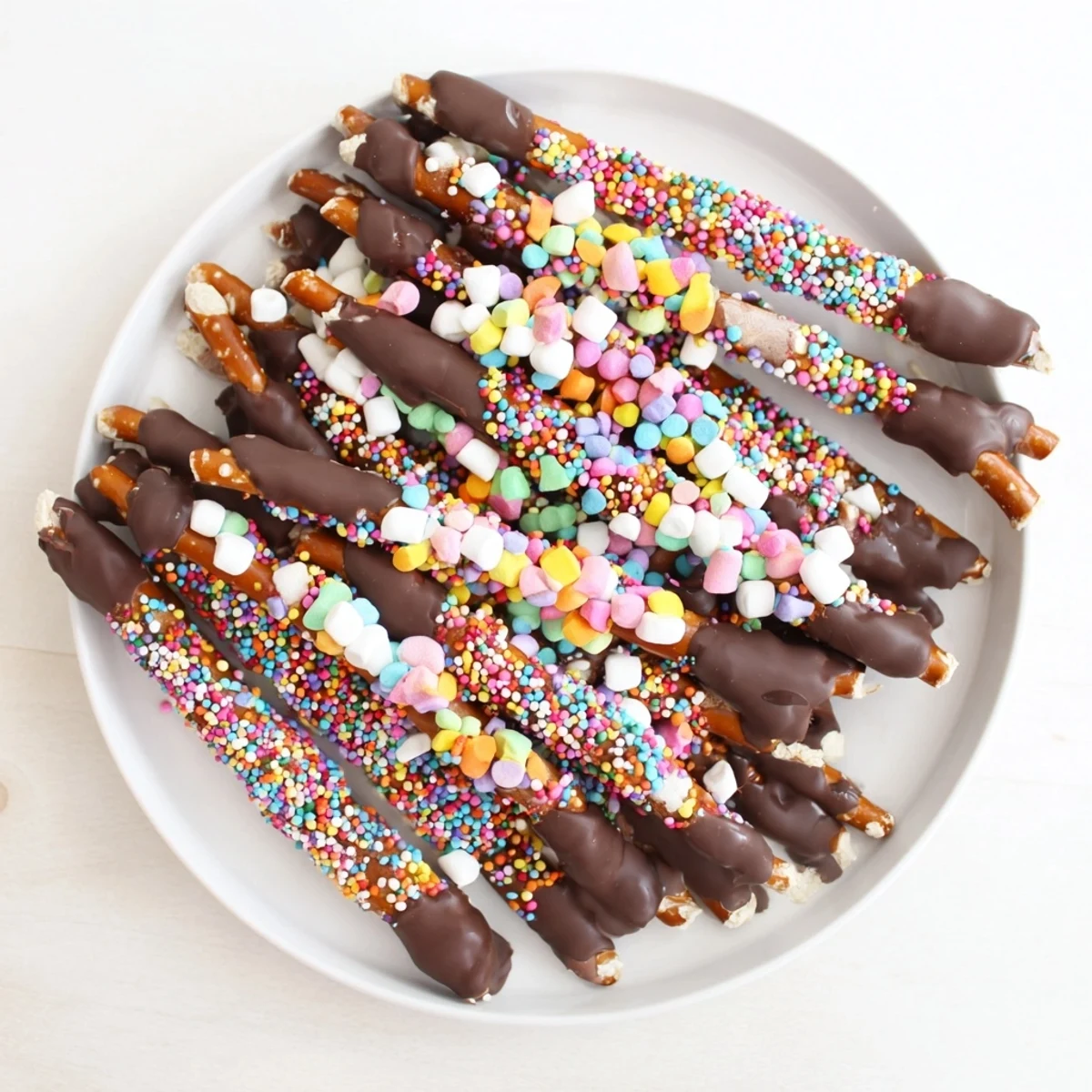 - 3. While the chocolate is still wet, roll each dipped rod in rainbow sprinkles, mini marshmallows, or candy-coated chocolates as desired.