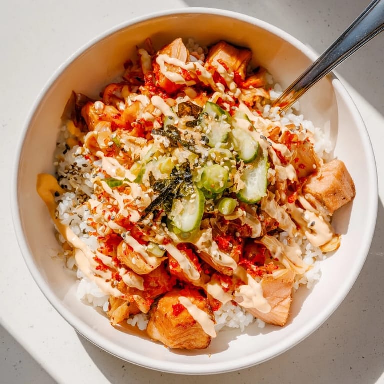 Save A vibrant, flavor-packed bowl featuring crispy salmon, fluffy rice, spicy mayo, tangy kimchi, and savory garlic for a perfect balance of textures and tastes.