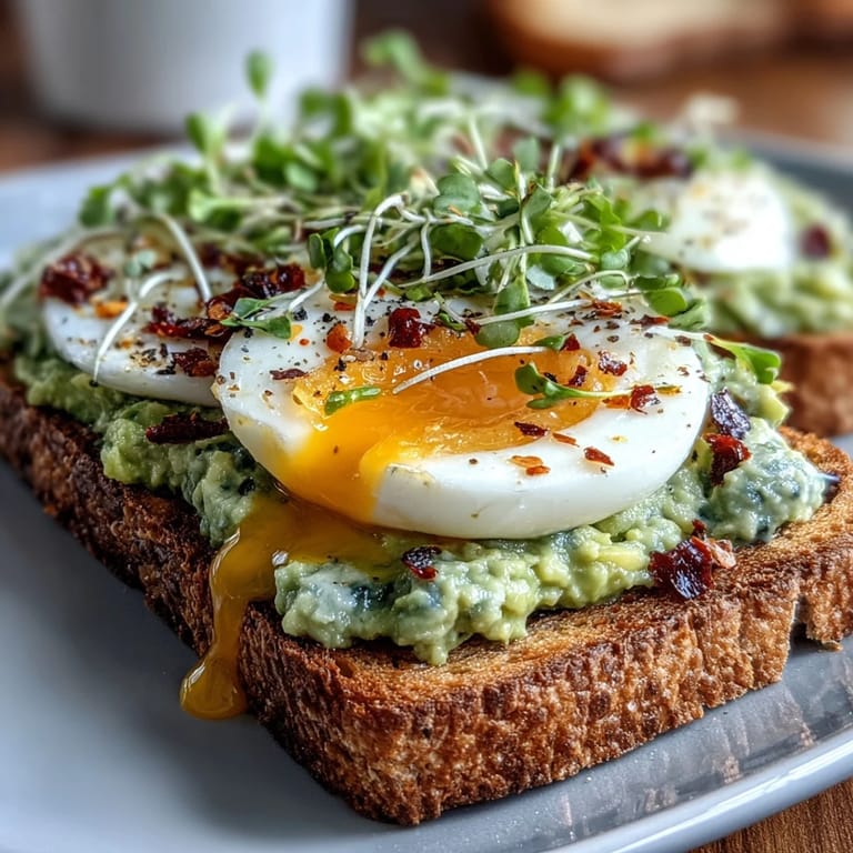 Save A vibrant, nutritious open-faced toast featuring creamy avocado, soft-boiled egg, fresh microgreens, and a hint of heat from chili flakes—perfect for a wholesome breakfast or light lunch. This dish combines the richness of ripe avocado with the protein-packed goodness of a soft-boiled egg, all topped with fresh microgreens for a peppery finish.